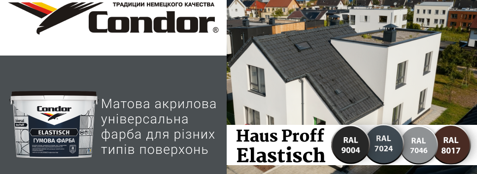 Також ми пропонуємо до Вашої уваги гумову універсальну фарбу для різних типів поверхонь для внутрішніх і зовнішніх робіт фарба Condor Hausproff Elastisch у готових кольорах та базі TR.