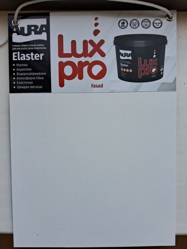 - Блиск (ДСТУ ISO 2813): не вище 10 GU при 85° (матова, G3, ДСТУ EN 1062-1). - Товщина сухої плівки: 100-200 мкм для одношарового покриття (E3, ДСТУ EN 1062-1). - Розмір частинок: не більше 30 мкм (дрібнозерниста, S1, ДСТУ EN 1062-1). - Паропроникність (ДСТУ EN 1062-1): висока, V1. - Водопроникність (ДСТУ EN 1062-3): середня, W2. - Маркування за ДСТУ EN 1062-1: G3|E3|S1|V1|W2|A0|C0 - Стійкість до миття: стійка до миття (1-й клас за ДСТУ EN 13300). - Стійкість до впливу атмосфери та сонячної радіації: покриття зберігає захисні та декоративні властивості в умовах помірно-континентального клімату не менше 7 років. Система покриттів являє собою: 1-й шар – ґрунтовка антикорозійна та два шари — фарба гумова універсальна TM Aura Luxpro Elaster. Загальна товщина сухої плівки не менше ніж 160 мкм. Випробування проводилися на підготовлених сталевих пластинах, в атмосферних умовах згідно із ДСТУ ISO 2810 та в лабораторних умовах, під дією штучних джерел сонячного випромінювання (везерометра), згідно із ДСТУ ISO 16474-2. Термін служби покриття залежить від підготовки поверхні, умов нанесення матеріалу та умов експлуатації готового покриття.