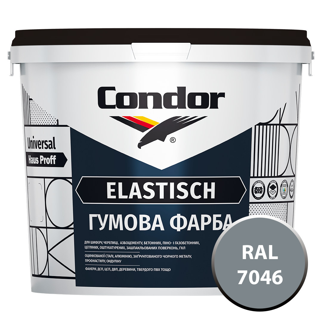 *Об’ємом 6 л фарби Condor Hausproff Elastisch (RAL 7046 Сірий) достатньо, щоб покрити приблизно до 24-40 м² в один шар за умови нормально підготовленої гладкої поверхні.