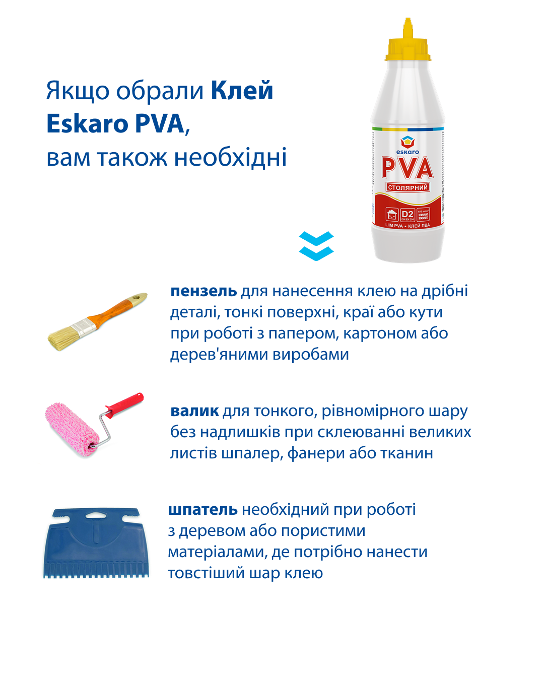 Універсальний клей ПВА для внутрішніх робіт.Склеювання в будь-яких комбінаціях: паперу, картону, шкіри, тканин, кераміки. Склеювання деревини, фанери, шпону, ДСП, ДВП. Ремонтне приклеювання керамічної облицювальної плитки, що «відірвалася», яка раніше була приклеєна на цементний клей (розчин). Приклеювання лінолеуму на теплій ворсовій основі. Для дитячої творчості, декупажу та дизайнерських рішень «hand-made» Чудово підходить для приклеювання стиків шпалер. Для виробів, які будуть експлуатуватися в умовах нормальної вологості. Для внутрішніх робіт. Не призначений для приклеювання матеріалів із пластмаси