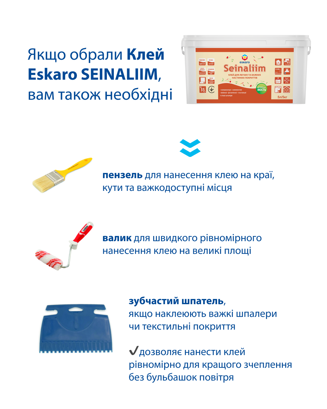 Клей для приклеювання скловолокнистих шпалер, шпалер під фарбування, паперових, флізелінових, вінілових, акрилових, важких, тиснених, структурних, тафтінгових, текстильних (тканих), джутових, натуральних, металізованих та інших типів шпалер на паперовій, флізеліновій, поліестеровій, скловолокнистій основі, а також армувального склополотна та флізеліну на вбираючу або пофарбовану поверхню в сухих приміщеннях.