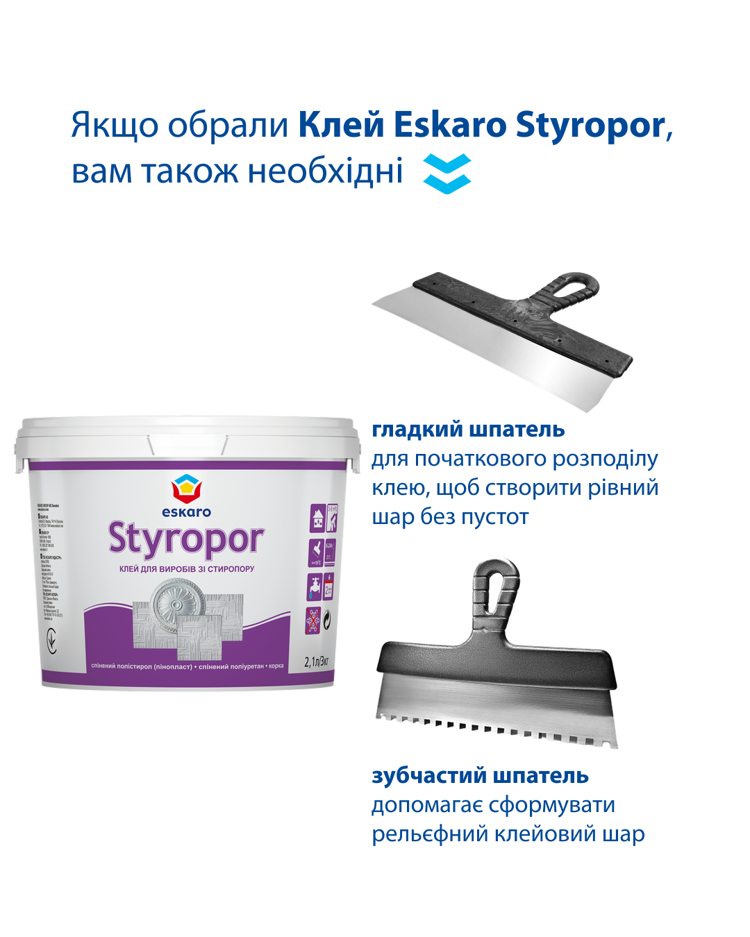 Розмішати клей. Під час наклеювання елементів декору з великою площею (наприклад, стельових плит) клей наносити на основу на площу до 2 м² смугами шириною 10–15 см. У разі малої площі зіткнення елементу декору з основою чи його великої маси необхідно наносити клей на основу та на елемент декору. Приклеїти протягом 10 хвилин. Час коригування – до 10 хвилин. Надлишки клею відразу прибрати. Температура приміщення, основи, елемента декору та клею повинна бути однаковою і не нижче +10°С, відносна вологість не вище 85%. |